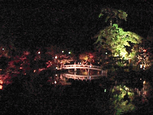 ライトアップは11月1日から12月10日まで。見頃は11月下旬のようです。これだけでも夜に来た価値はありました。ここの池泉回遊式の庭は複雑な地形と建物の配置を逆手に取った技巧的にすばらしいものですが、夜は一段とその良さが光ります。金閣や清水のライトアップは人が多過ぎて良くないらしいです。