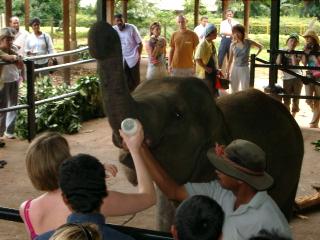 キャンディの西30kmほどにある、ピンナワラ象の孤児園。象に触れる。硬くて長い毛で覆われているのが意外。ショータイムにはミルクをあげたりできる。
