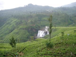 大小の湖や滝がたくさん、奥日光の10倍くらいの雄大な景色が広がる。左上の写真は中禅寺湖ほどの大きな湖だが、標識もないしガイドさんも気にせず通りすぎようとしたから、止まってもらって写真を撮った。ヌワラエリヤの北西 15km くらい。左下は Devon の滝、ヌワラエリヤの西 15km。このあたりは 50m 以上の滝が多い。周辺の山は皆茶畑。車で3時間以上、延々と茶畑が続く。