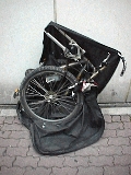 自転車を電車に載せるには、専用の袋に入れる。座るところの下にある黒い塊がその袋。